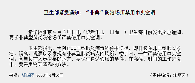 經(jīng)歷過“非典”的朋友想必還記得,2003年夏天,為防止病毒傳播,原衛(wèi)生部曾下發(fā)禁令,要求有“非典”病人的場所不能開中央空調(diào)。