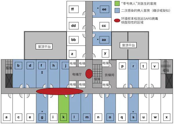注:*表示一個房間有2人感染;?表示“零號病人”曾在這個房間逗留(來源:wwwnc.cdc.gov[5])
