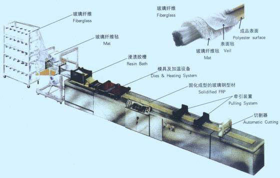 拉擠成型工藝是將浸透膠液的連續(xù)無捻粗紗、氈、帶或布等增強(qiáng)材料,在牽引力的作用下,通過模具加熱擠拉成型、固化,連續(xù)不斷地生產(chǎn)長度不限的玻璃鋼型材。